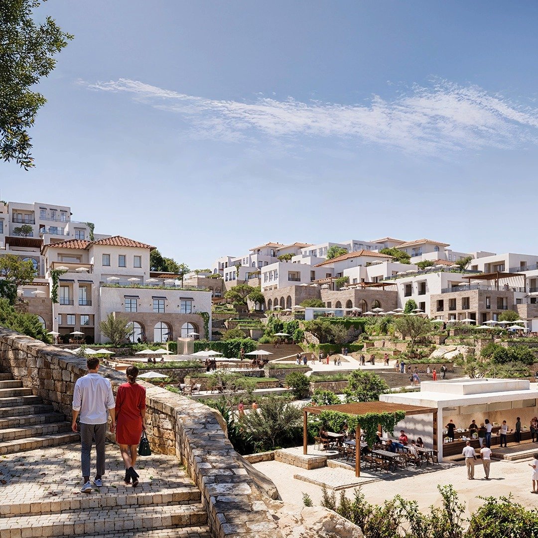 Architectural themes reflect whitewashed Cycladic forms, paired with modern Mediterranean landscaping and pedestrian-first design.